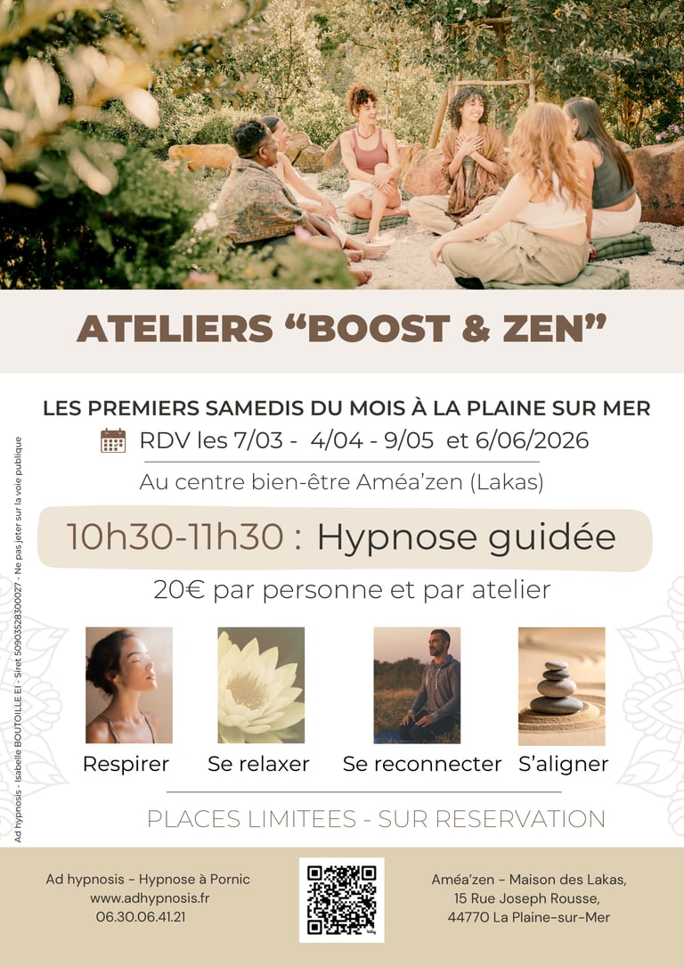 Les ateliers "Boost & zen" sont une création de Ad hypnosis, cabinet d'hypnose à Pornic.